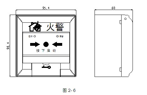 消火栓按钮采用明装方式,分为进线管明装和进线管暗装:进线管暗装时只需拔下按钮,从底壳的进线孔中穿入电缆并接在相应端子上,再插好按钮即可安装好,安装示意图见图2-8;进线管明装时只需拔下按钮,将底壳下端的敲落孔敲开,从敲落孔中穿入电缆并接在相应端子上,再插好按钮即可安装好,安装示意图见图2-9;安装孔距为60mm。